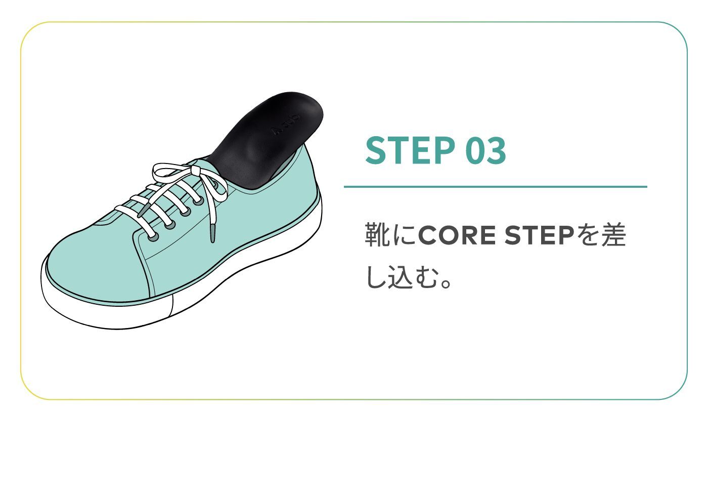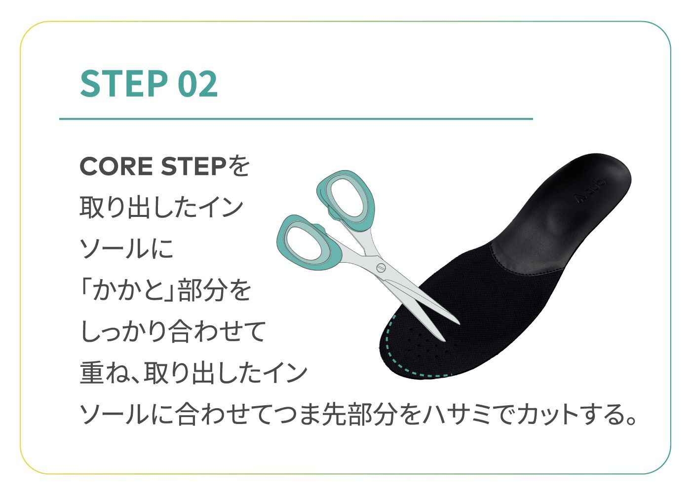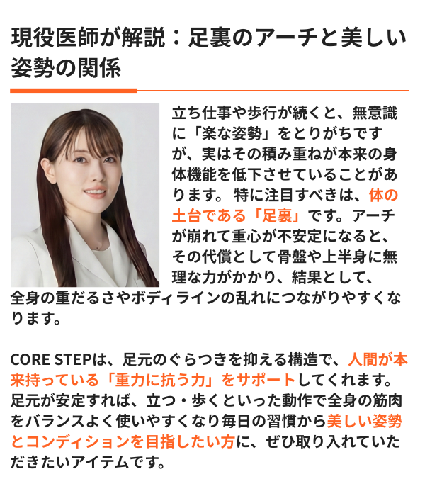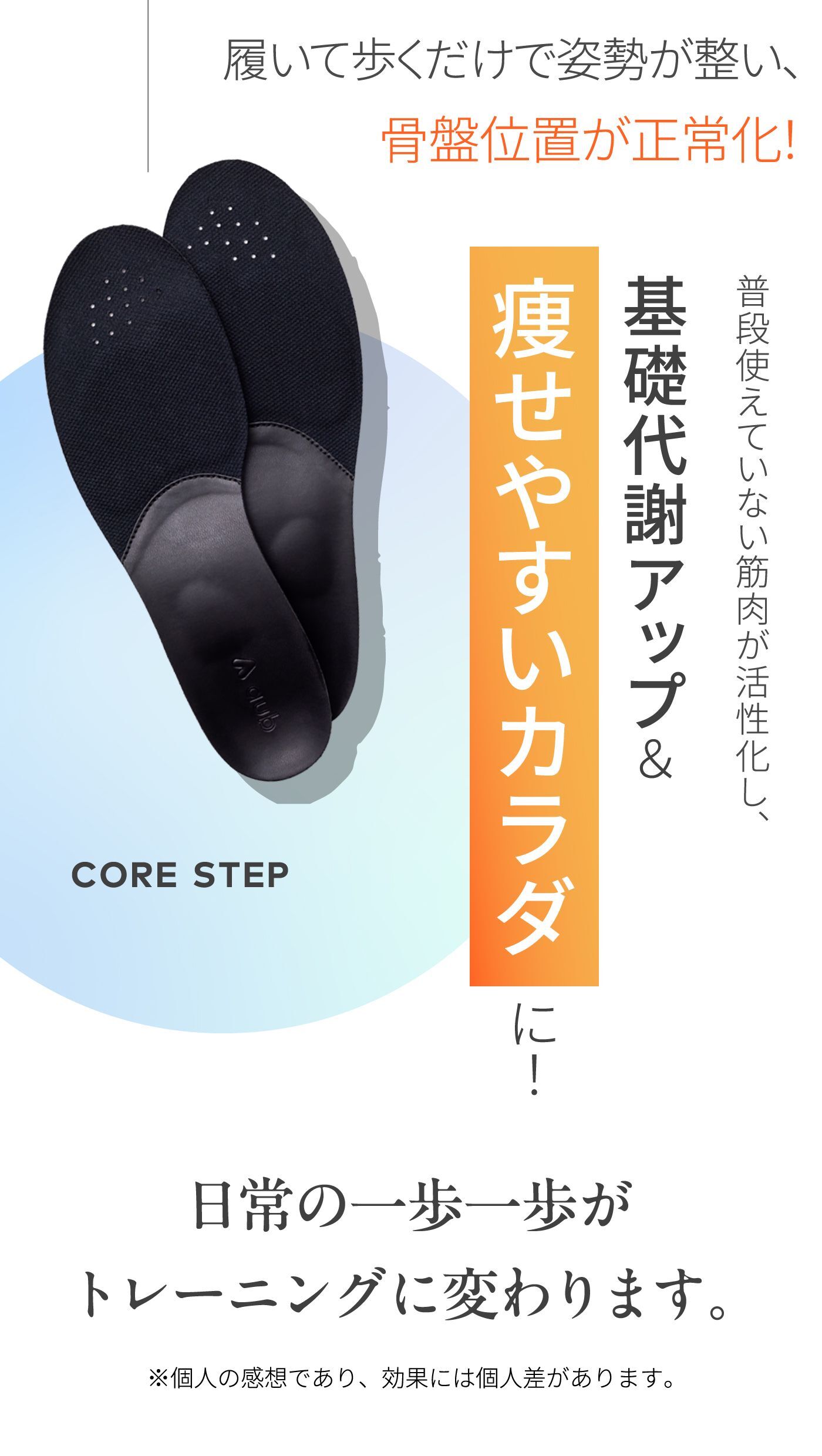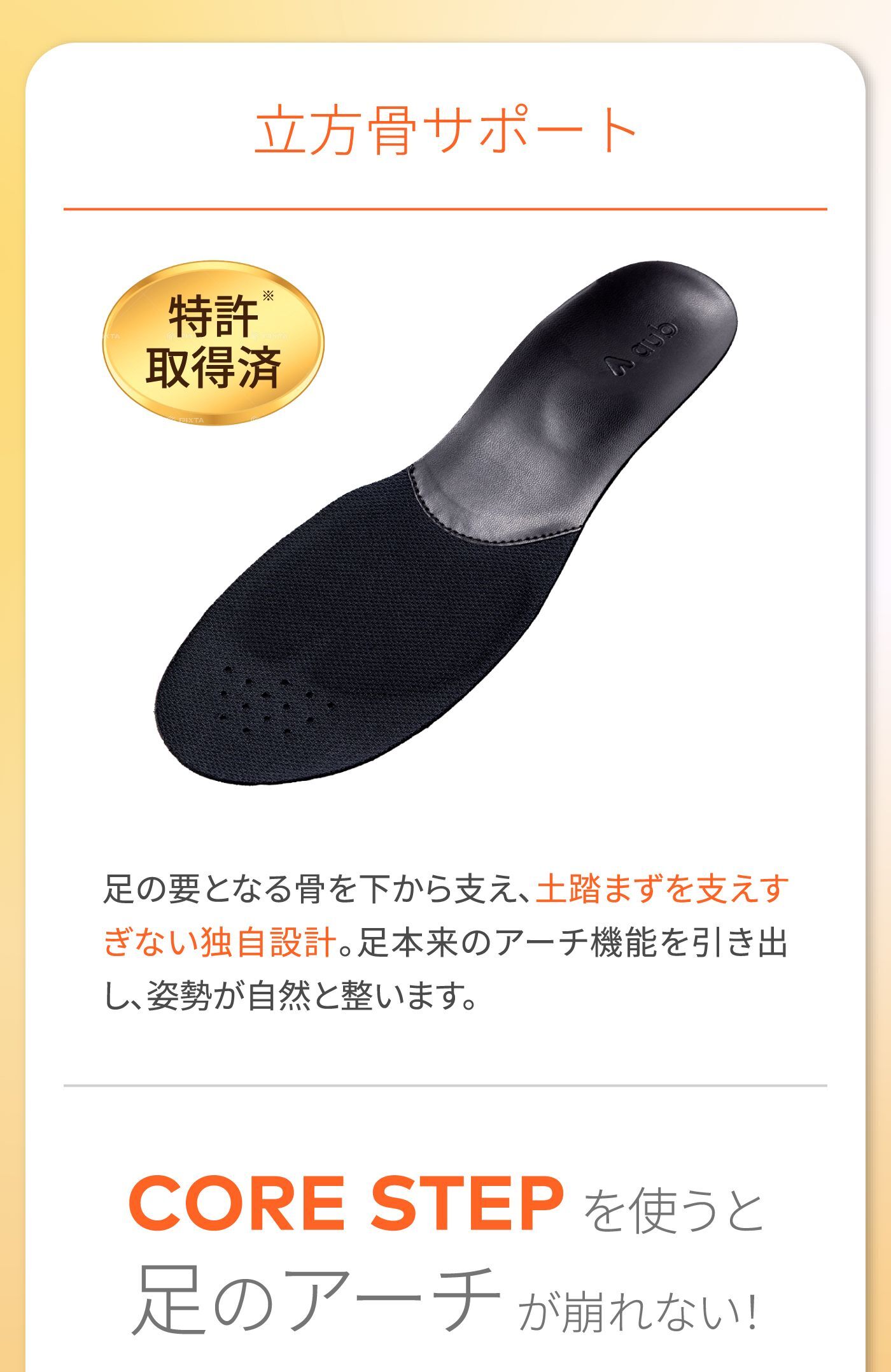 もともと靴に入っていたのインソールは取り外してご使用ください。 重ねてご利用いただく事により、CORE STEPの機能が失われる可能性がございますのでご注意ください。 元の中敷きの取り外しができずやむを得ず重ねる場合は、元の中敷きが薄いものであり、かつ靴のフィット感にゆとりのあるものに限ります。